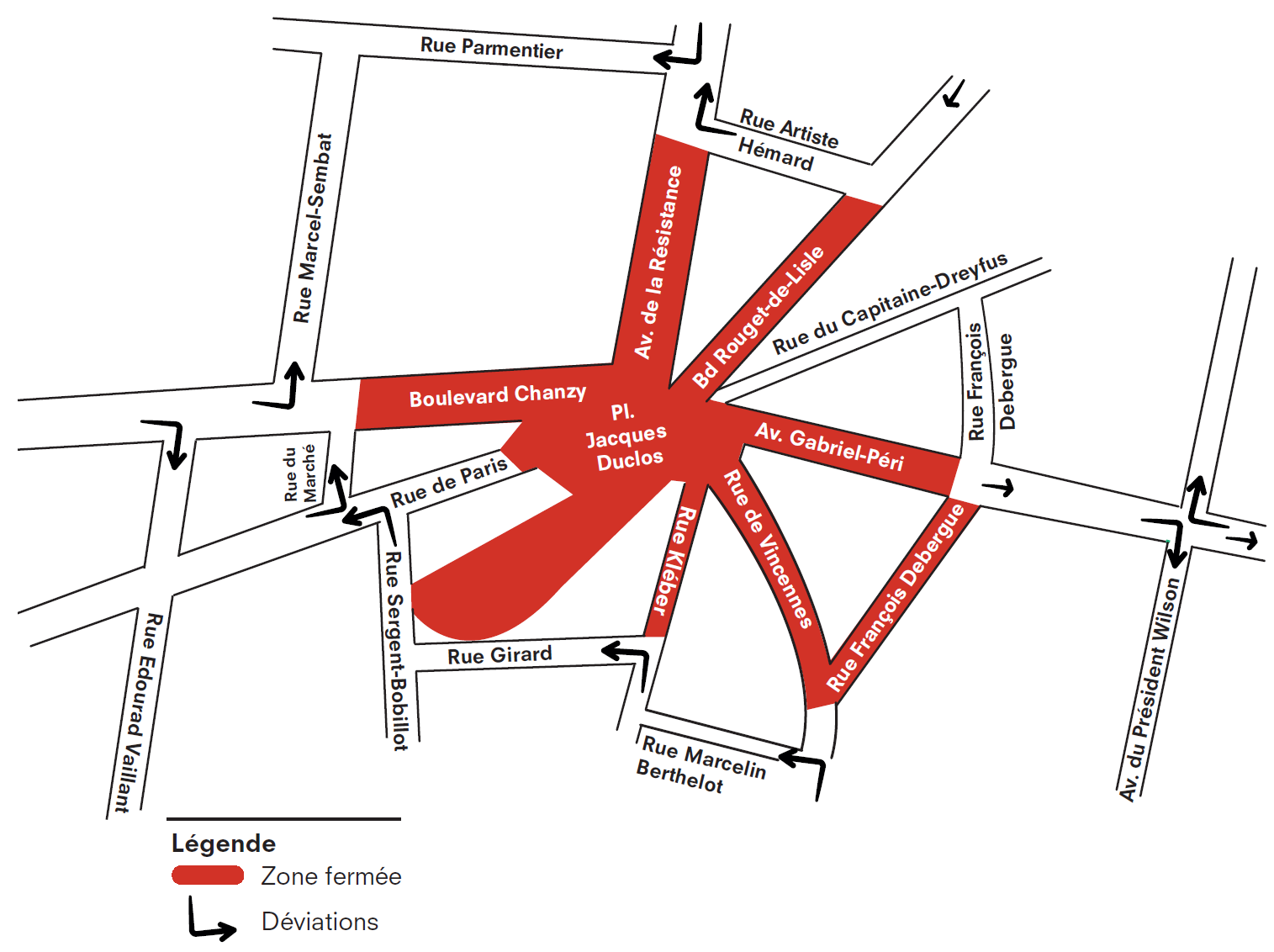 L’arrêt Jeanne-d’Arc en direction de Croix-de-Chavaux est reporté au 83 rue de Stalingrad. Les arrêts Wilson - Gabriel Péri sont non desservis. Le terminus Croix-de-Chavaux est reporté au 10 rue Franklin. Nous vous prions de bien vouloir nous excuser de la gêne occasionnée.