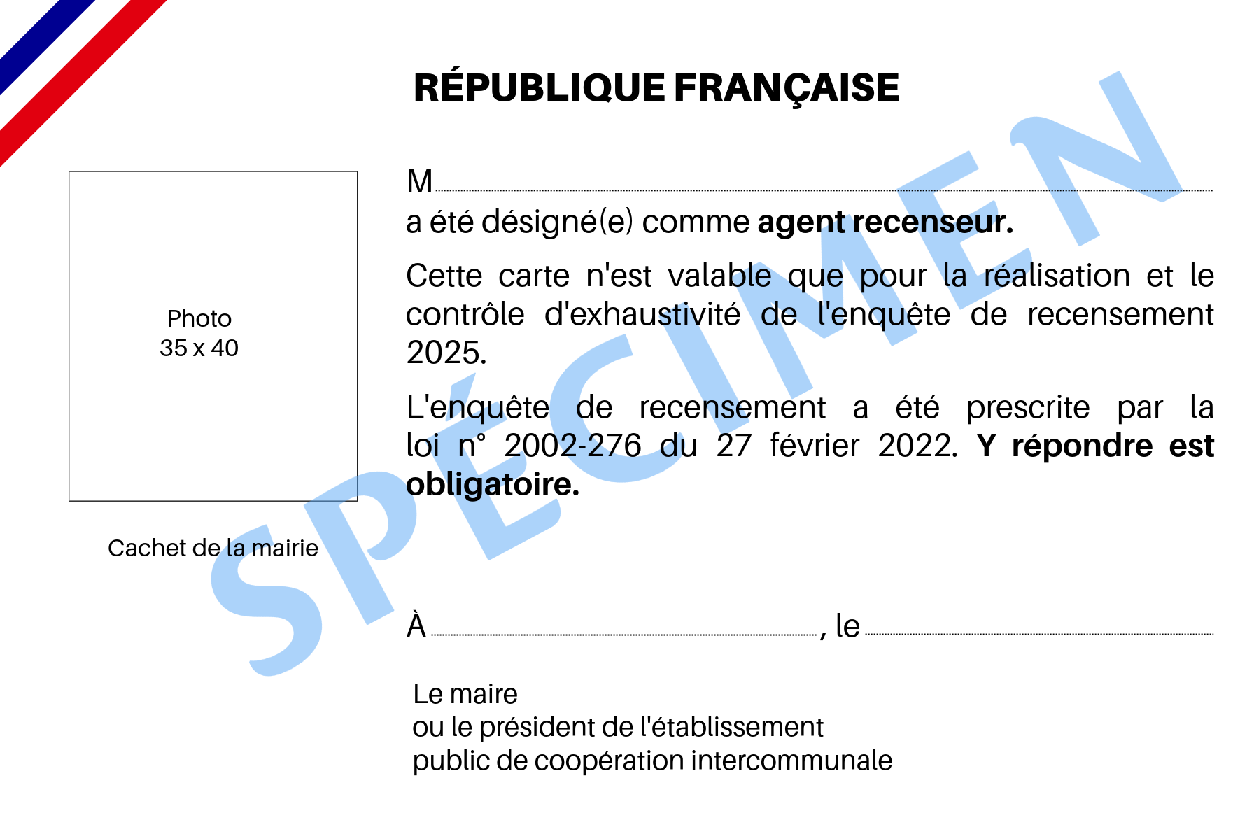 Votre agent recenseur a toujours avec lui sa carte tricolore avec sa photo, signée par le Maire, dont vous trouverez un spécimen ci-dessous. Chaque année, la période du recensement est propice aux faux agents ! En cas de doute, appelez le service recensement ou la Police nationale.