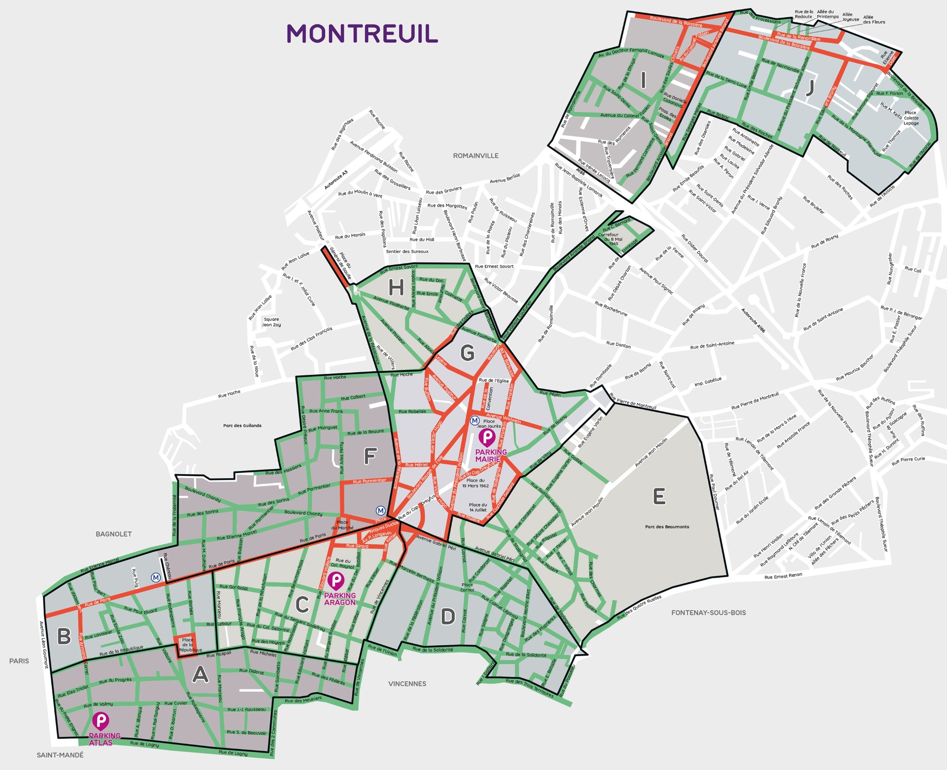 Il existe, à Montreuil, 2 zones de tarification différentes (rouge et verte) ainsi que des tarifs forfaitaires résident et non résident. Consulter la carte interactive des quartiers de stationnement résidentiel et des zones de stationnement payant.