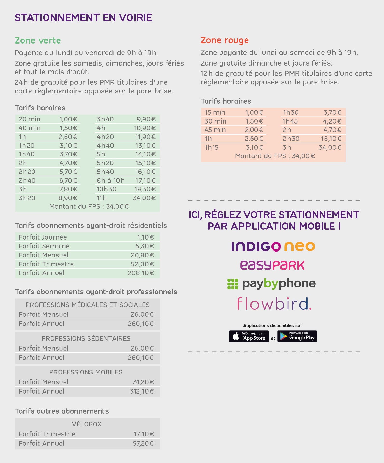 Vous pouvez payer votre stationnement dans les deux zones via applications mobiles comme Indigo Neo, EasyPark, PayByPhone, ou Flowbird.